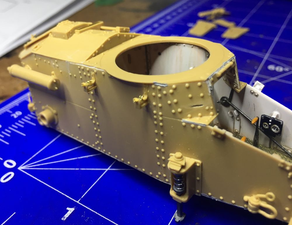 Als nächstes kamen die Seitenteile an das Unterteil. Das verzogene Teil habe ich erst an einem Ende angeklebt, über Nacht trocknen lassen und dann Stück für Stück fixiert und veklebt. Hat etwas länger gedauert, ging aber recht gut. Leichte Spalte habe ich teilweise mit Sekundenkleber und Acylputty von Vallejo aufgefüllt. Bei letzterem kann man nach ein paar Minuten den Überschuß prima mit feuchten Wattestäbchen wegwischen. Das spart Schleifarbeit und schont Details.