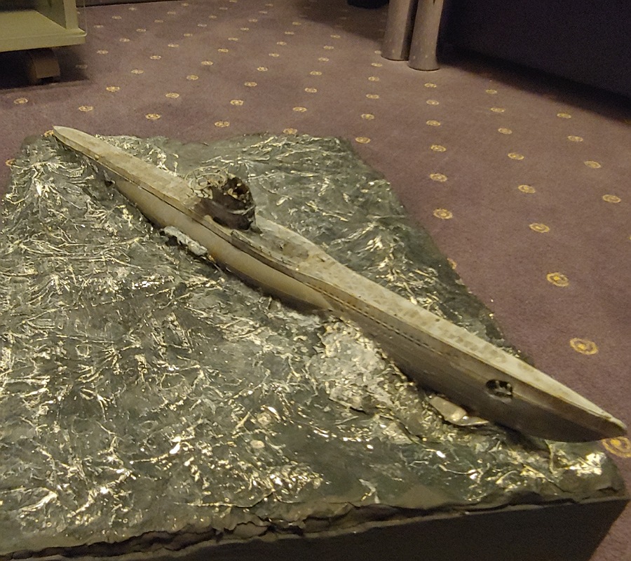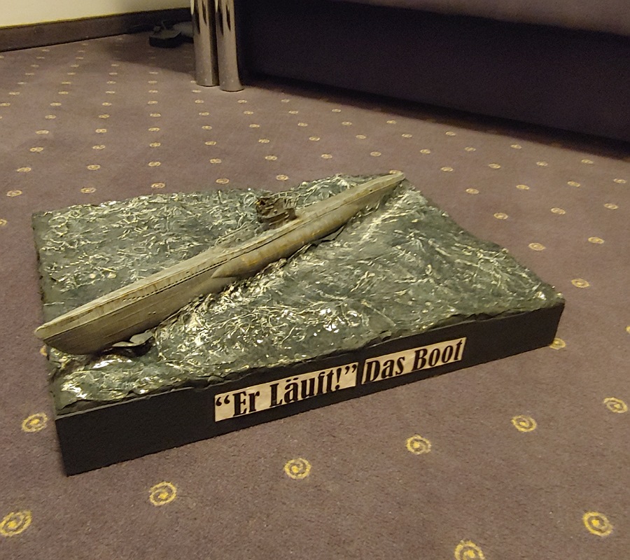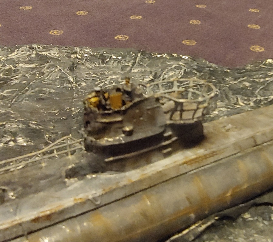 So sieht der Turm jetzt in meinem Diorama aus.... Und so im film. Klar es gibt noch gewisse Unterschiede aber ich finde es ist akzeptabel.... Hier noch das ganze boot: Was mache ich das nächste mal anders? Das Boot tieferlegen, eine größere Platte kaufen und KEIN Feuerzeug