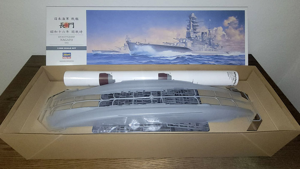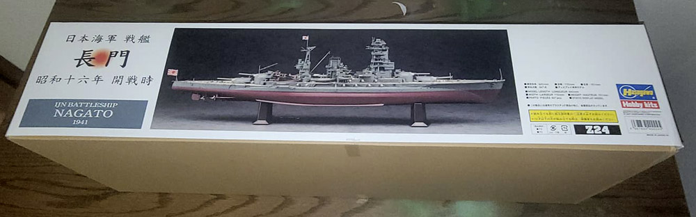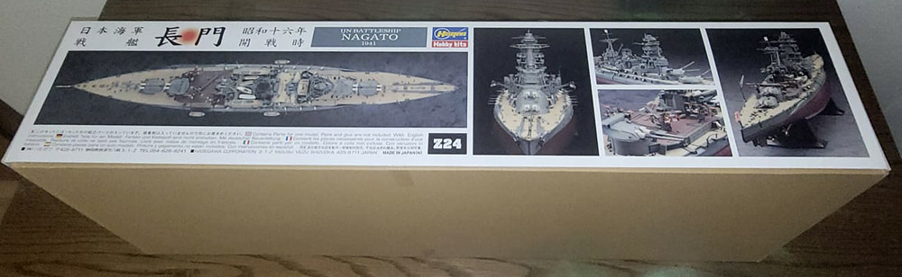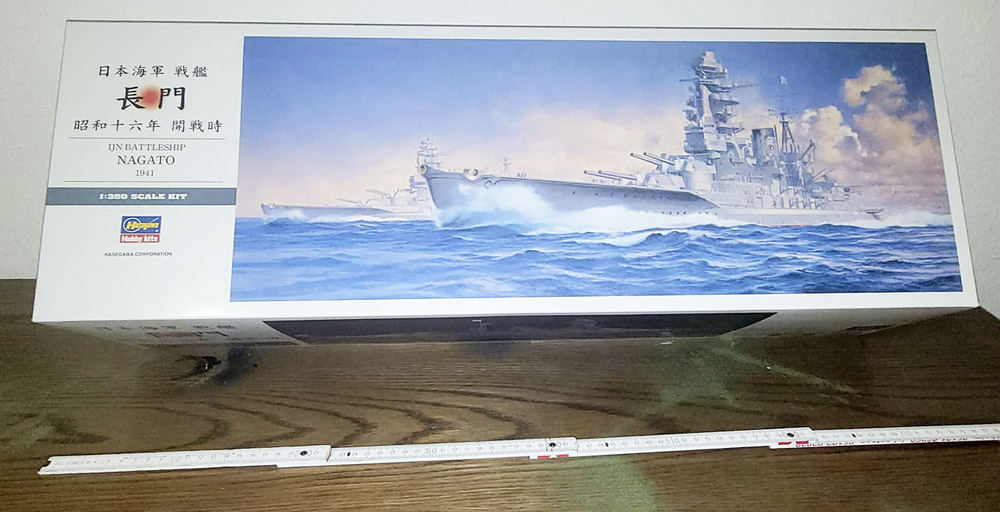 Der Stülpkarton hat eine Größe von 76 x 25,5 x 16 Zentimeter und zeigt neben einigen japanischen Schriftzeichen ein Bildnis der Nagato auf See, im Hintergrund ist ihr Schwesterschiff Mutsu angedeutet. Lesbare Angaben zu Größe, Inhalt und Maßstab des Modells sind auch auf dem Karton, man muss sie nur finden.