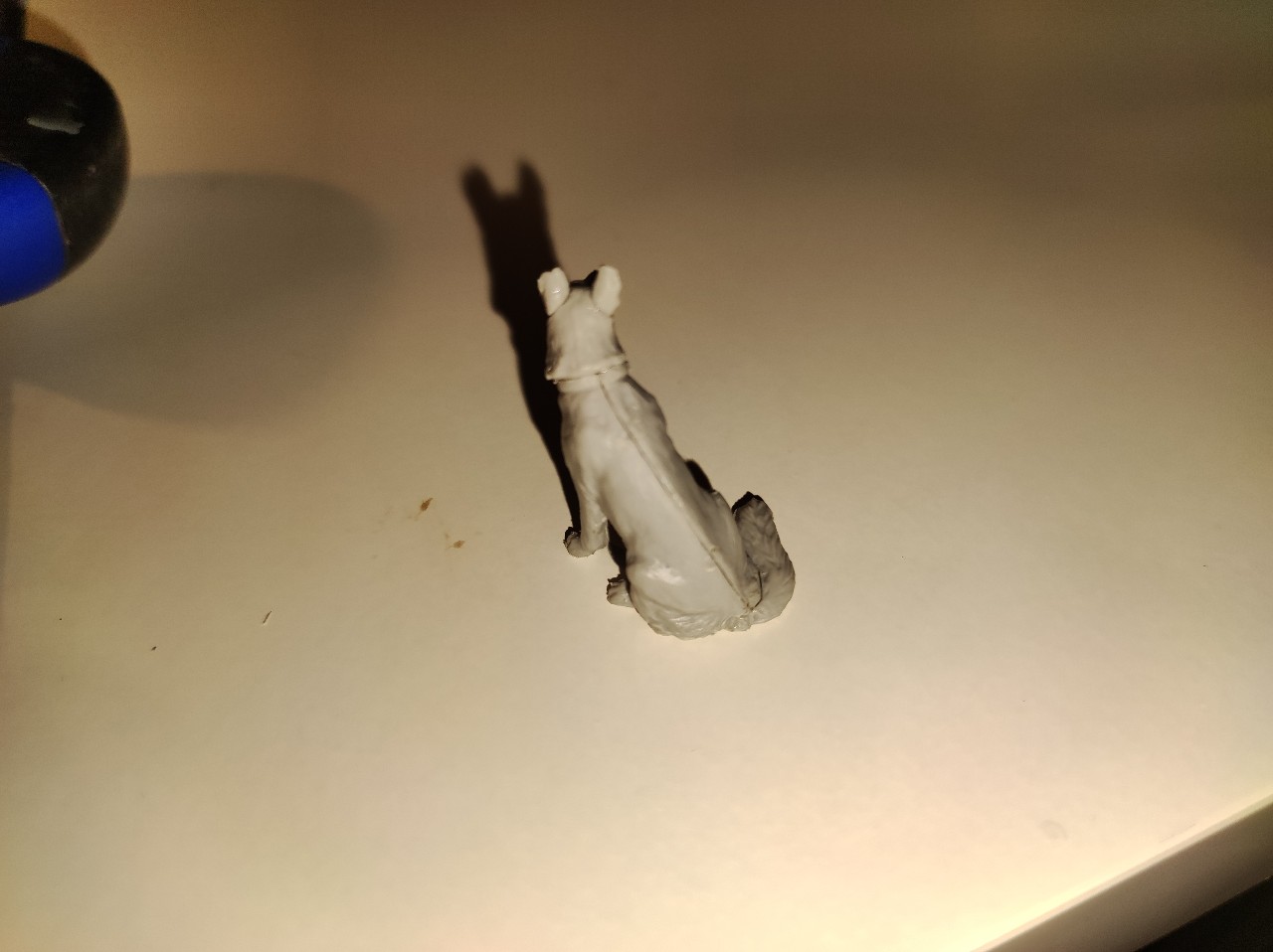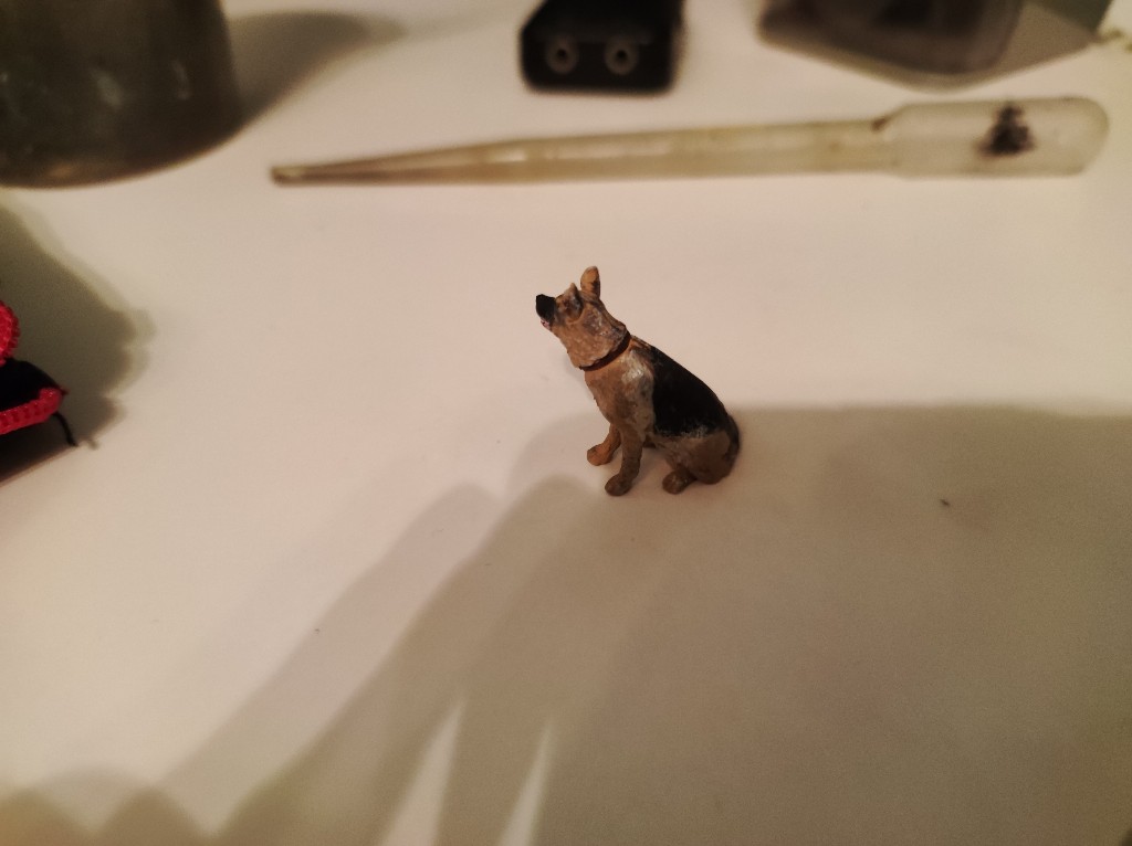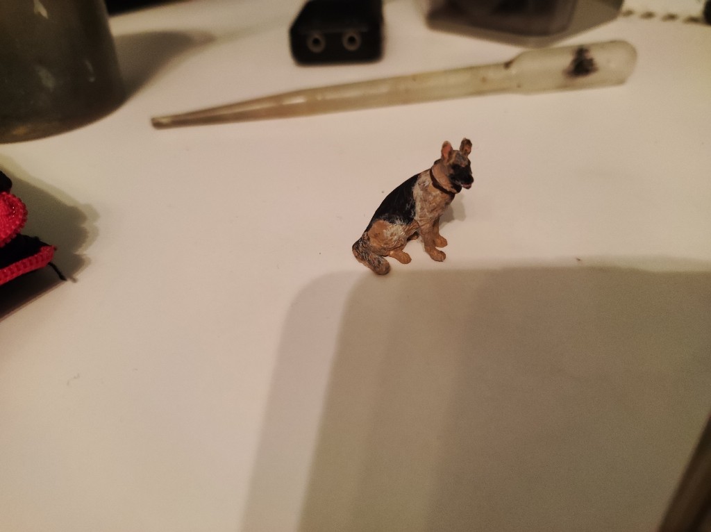 Grundiert hab ich den Hund mit Ocker, anschließend die schwarzen Stellen mit Anthrazit und die helleren Stellen an der Schulter mit beige Seidematt. Mit staubgrau und Hellgrau und dem Beige habe ich dann noch Trockengemalt. Das Halsband wurde mit Lederbraun gemacht. Das Maul mit einem selbst gemachten Rosaton und die Zähne weiß. Die Nase und Augen mit Schwarz Seidematt