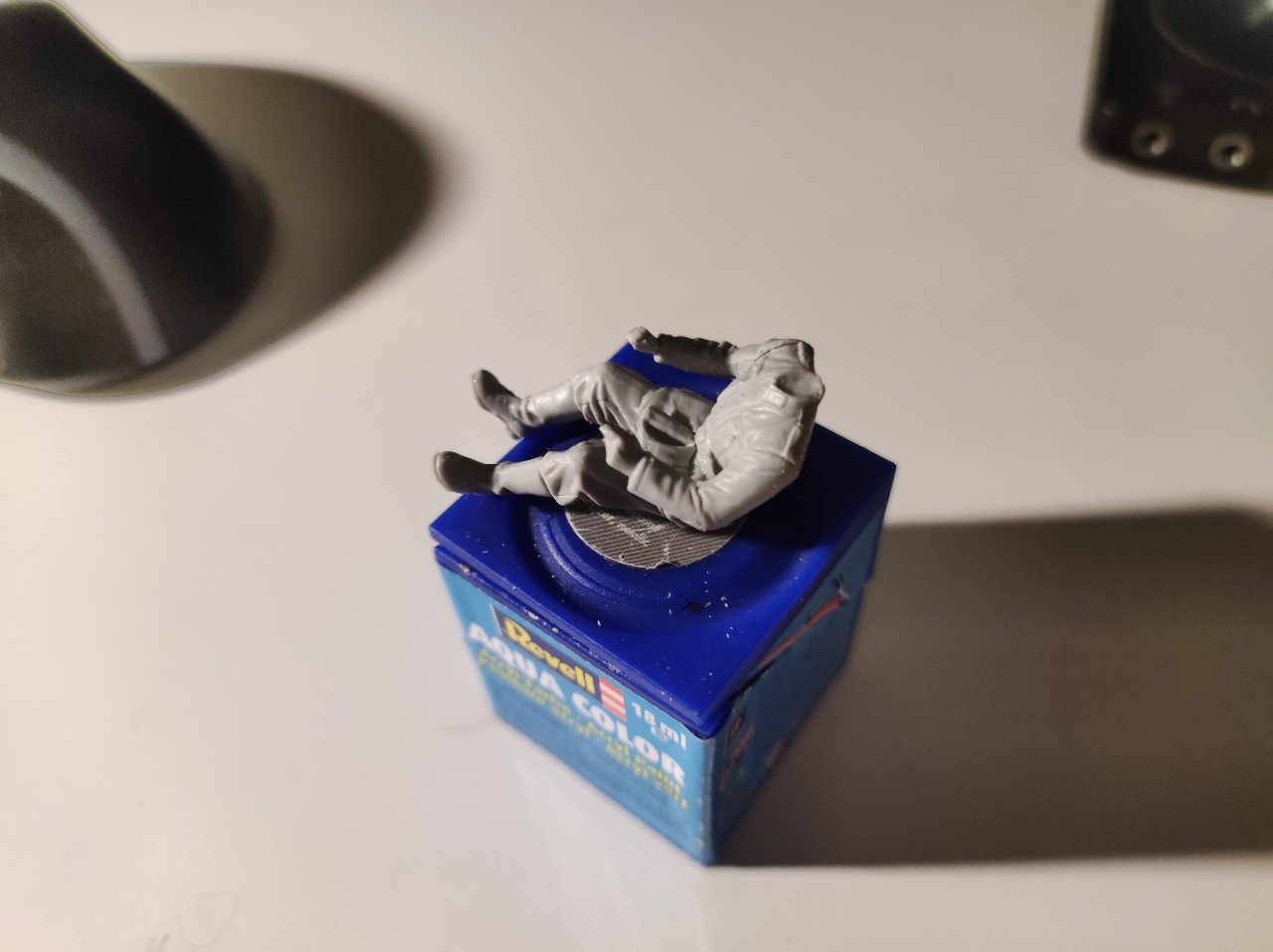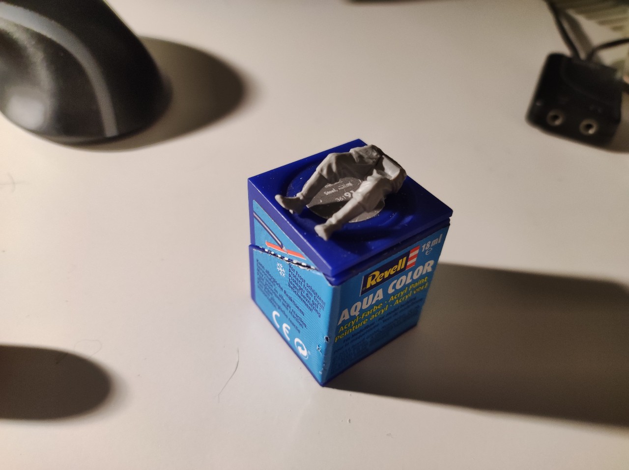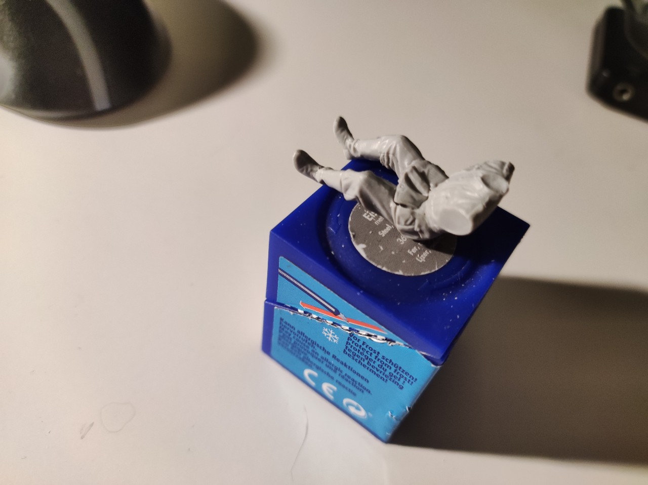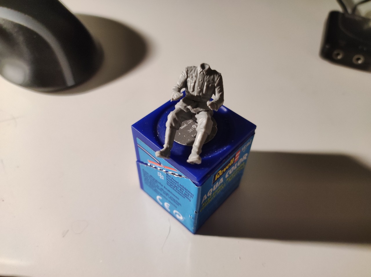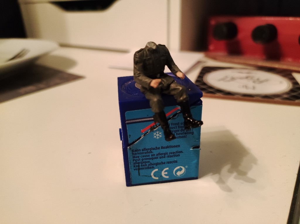 Dann beides zusammengefügt und die Haare gemacht, hier mit Afrikabraun als Grundton, dann mit Ocker, Sand, Gelb, braun und Grau trocken gemalt. Die Decals für die Uniform waren einfach unbrauchbar... Viel zu dick und haben nicht gehalten bzw konnte man nicht Mal mit verdünner an die Figur anpassen... Achja sie waren auch brüchig...