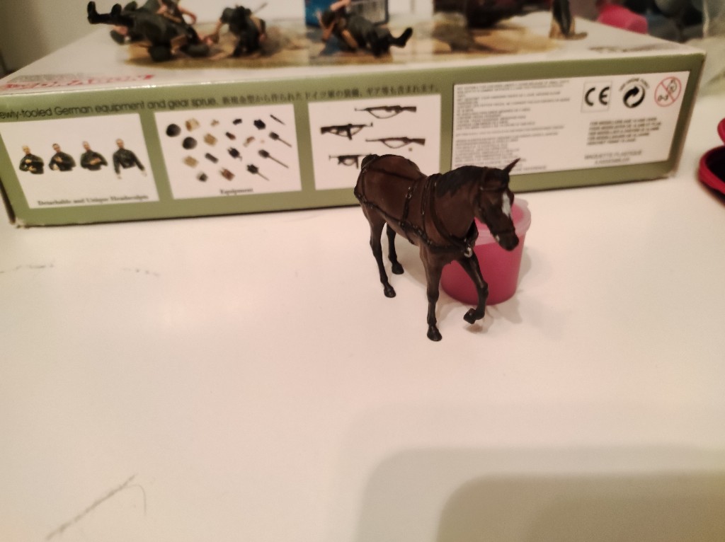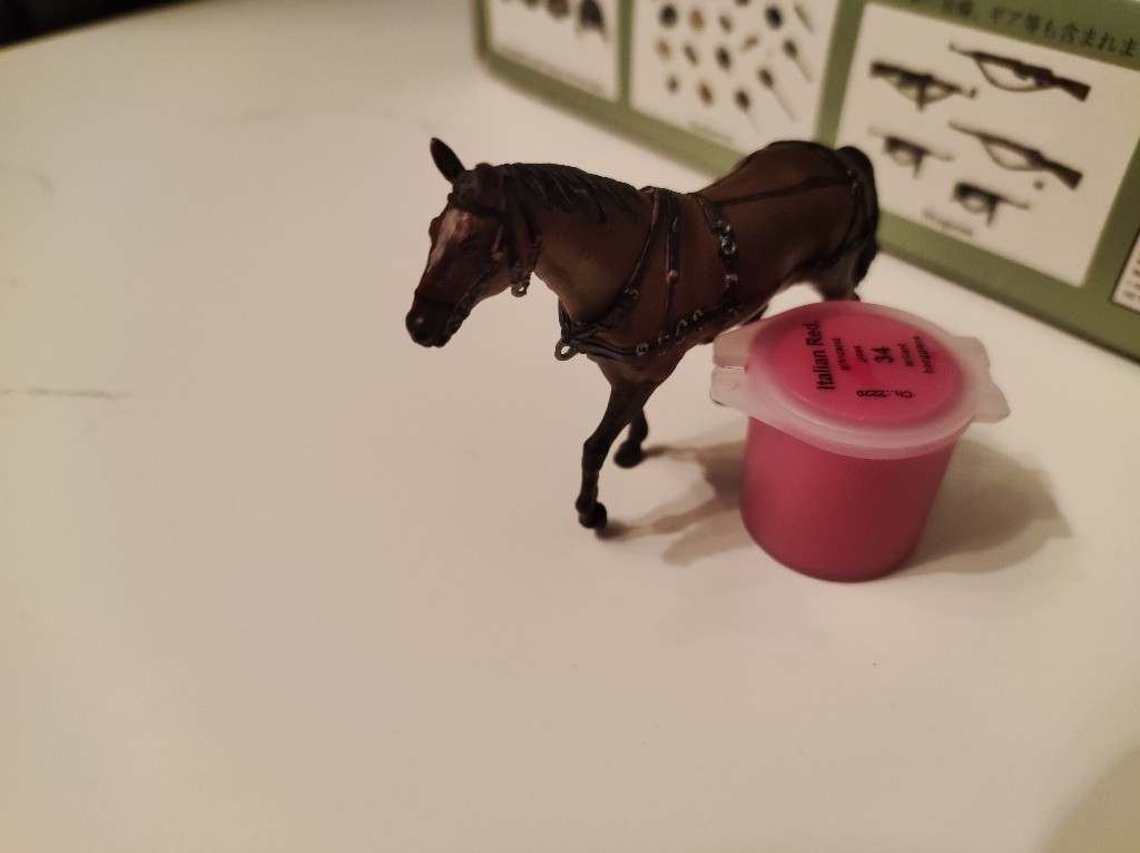 Die Pferde waren dann die größere Herausforderung, ich habe die mit Lederbraun bemalt, anschließend mit Anthrazit die dunkleren Stellen an den Beinen und dem Gesicht. Mähne und Schweif mit Schwarz und Augen mit Schwarz Seidematt und den weißen Streifen auf der Stirn (mir fällt gerade der Name nicht ein wie das heißt :lol: ) aufgehellt mit helleren Lederbraun. Die Geschirre habe ich mit schwarz Seidematt bemalt:
