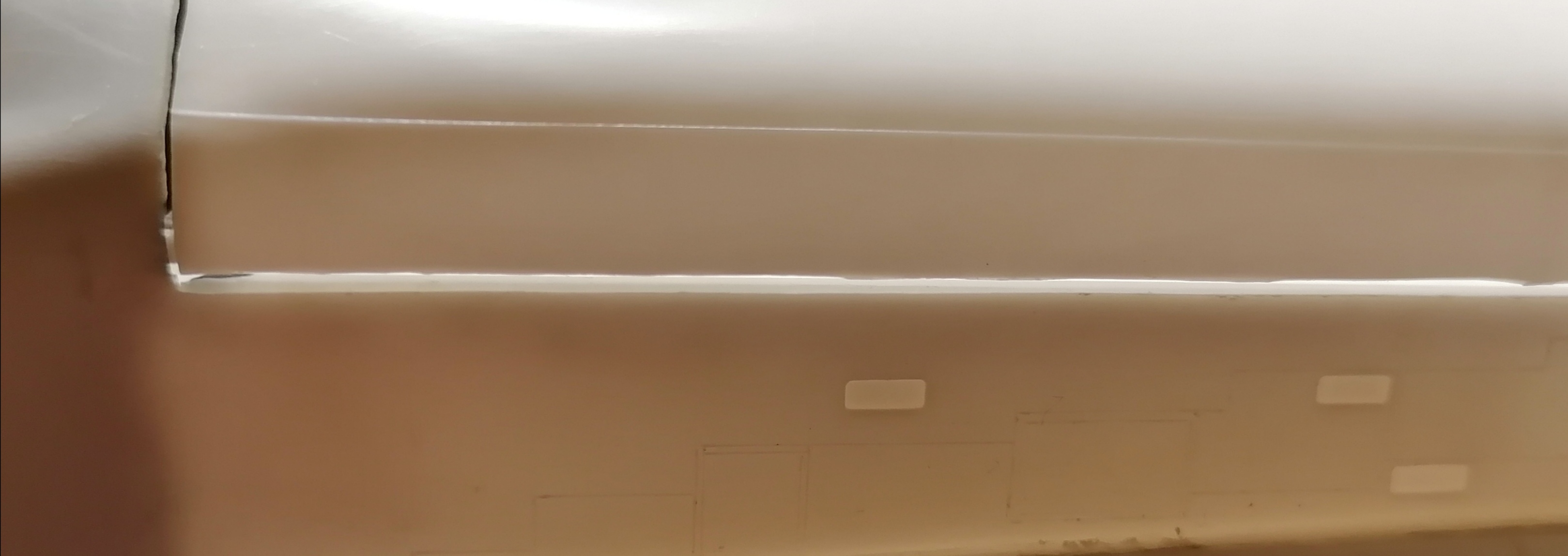 Mal ein Foto von den Spalten. Wie gesagt, ich möchte unbedingt vermeiden, dass ich von außen die Struktur wegschleifen muss. Ich hab jetzt von außen Tesaband angebracht. Ich brauche jetzt eine Möglichkeit, den Spalt von innen mit einem flüssigen Füller aufzufüllen.
