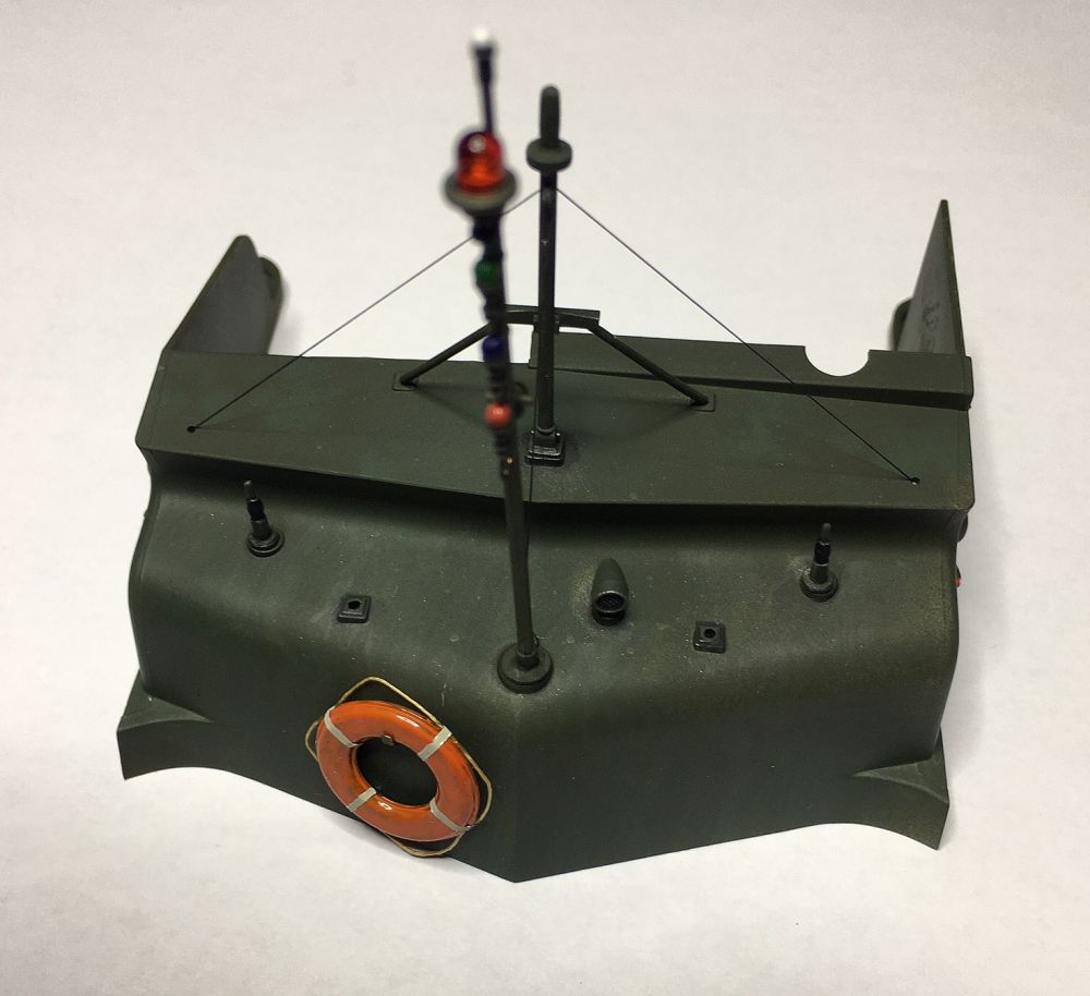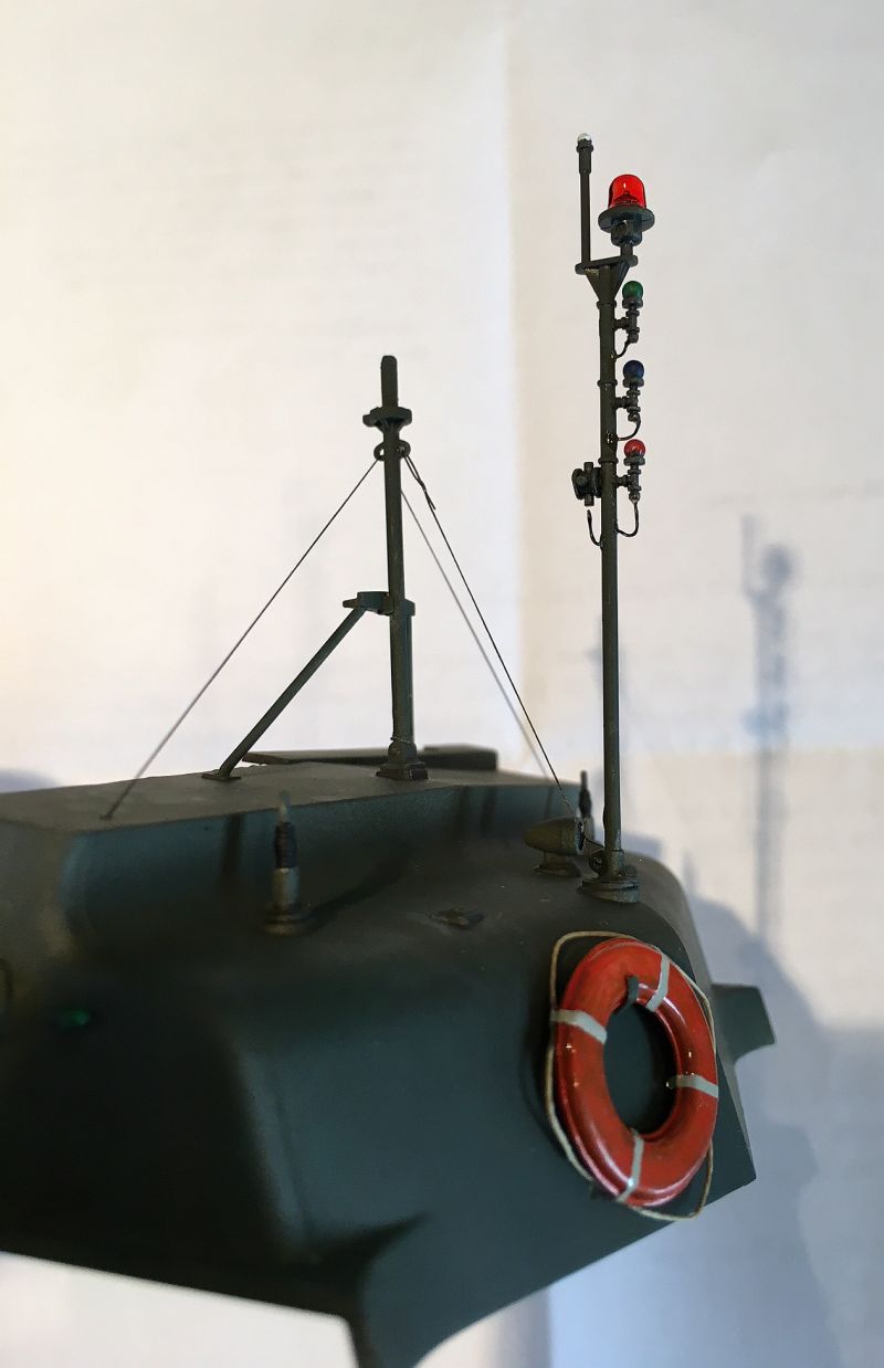 Danach ging es mit dem Aufbau farblich genauso weiter. Die verschiedenen Signalleuchten wurden grün, blau und rot und verkabelt. Die Masten sind auch schon mit dehnbarem Faden abgespannt. Dem Schwimmreifen habe ich eine Schnur aus Garn samt Bandagen aus Schokofolie verpasst. Am Aufbau sind auch verschiedene Ätzdetails verbaut, die jedoch nur bei sehr genauem Hinsehn auffallen.