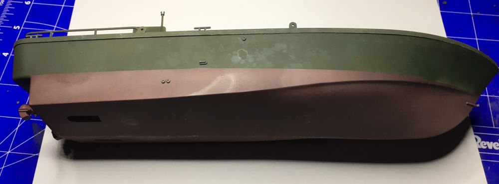 Danach wurden mit einer Schablone von Uschi Flecken in olive gesprüht. Der Unterwasseranteil bekam aufgehelltes hull red.