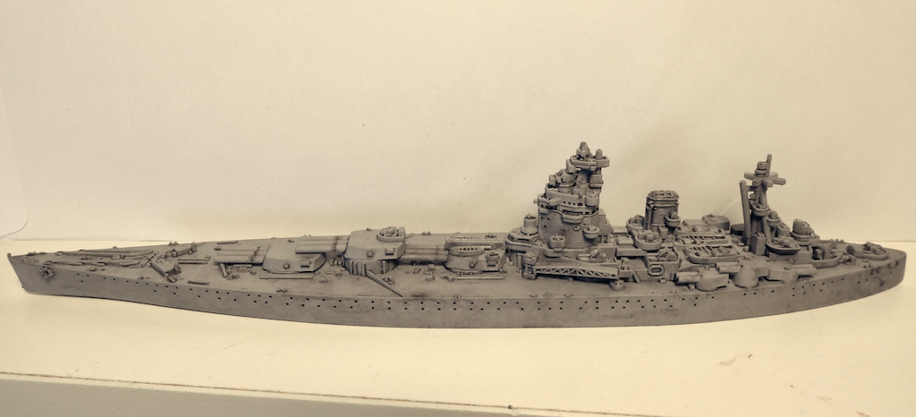 Um die Entwicklung und Veränderungen am Modell besser darstellen zu können, habe ich noch einen zweiten Rohling (den Luxus kann man sich in der 1/1200er Welt halt für 20 € leisten) gekauft und ihn hellgrau mit Revell Aqua Color und mit in Terpentinersatz gelöster schwarzer Ölfarbe bemalt.
