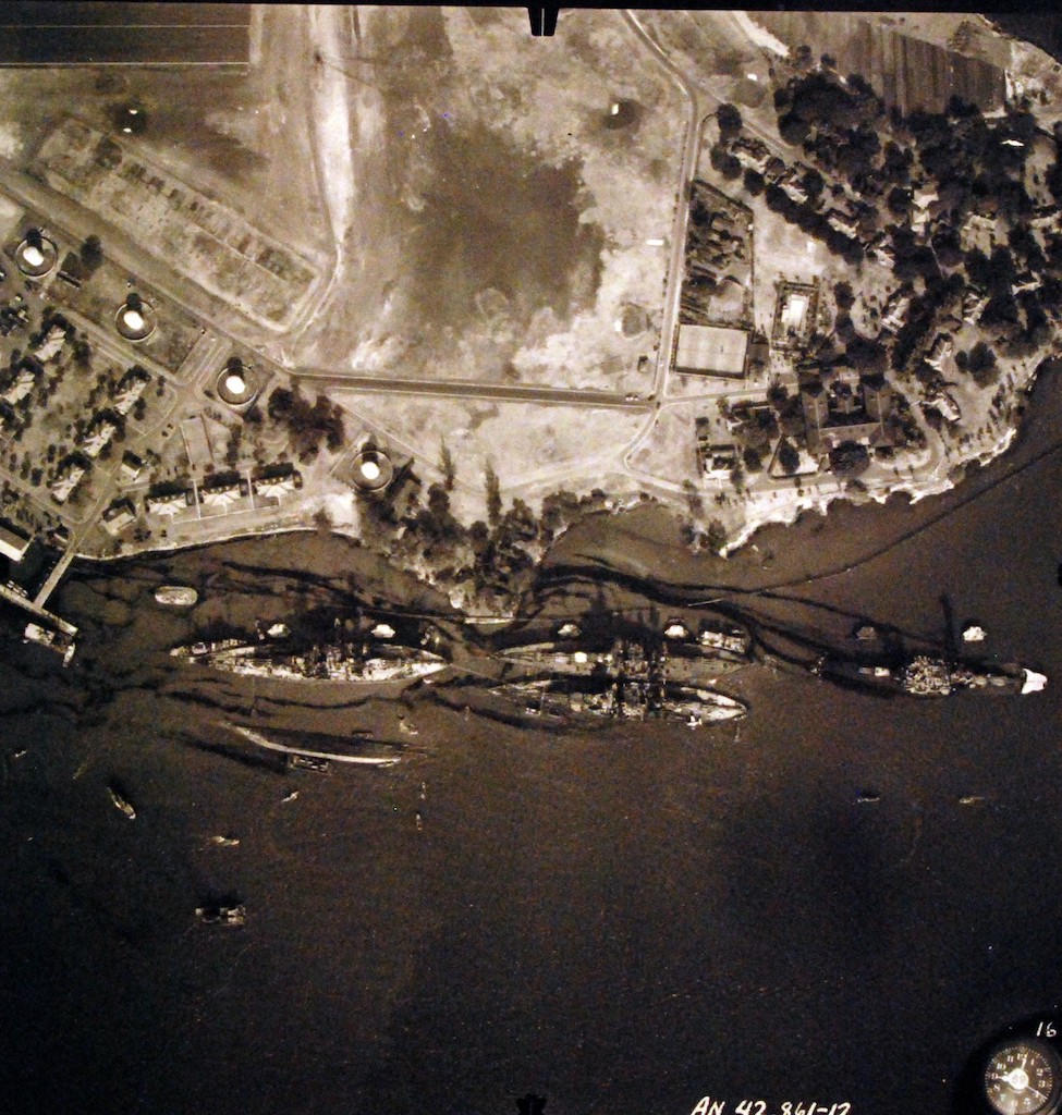Wie sieht es eigentlich mit dem aktuellen Stand deines Battleship Row-Dioramas aus? Hier noch eine Luftaufnahme kurz nach dem Angriff (zu beachten ist das auslaufende Öl aus den halbgesunkenen Schiffen) - vielleicht kannst du das ja brauchen?