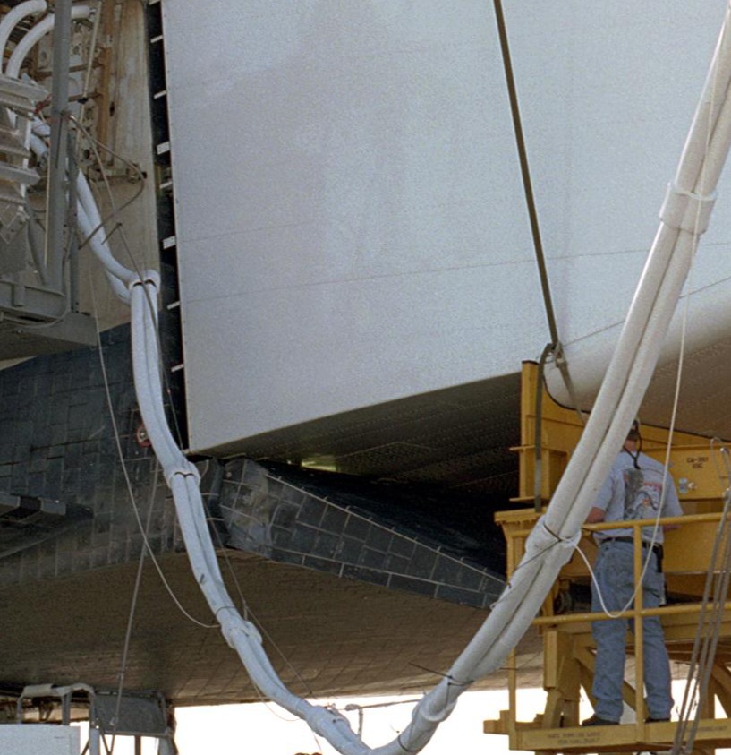 Das große schwarze Scheunentor unterhalb der SSME (SpaceShuttleMainEngines) wird als "BodyFlap" bezeichnet und tatsächlich nicht demontiert. Die weiße Abdeckung für die SSME (aerodynamic fairing ) wird oberhalb dieser"flap" montiert und zusätzlich mit seitlichen Abdeckungen ergänzt. (Quelle aus nasa.gov)