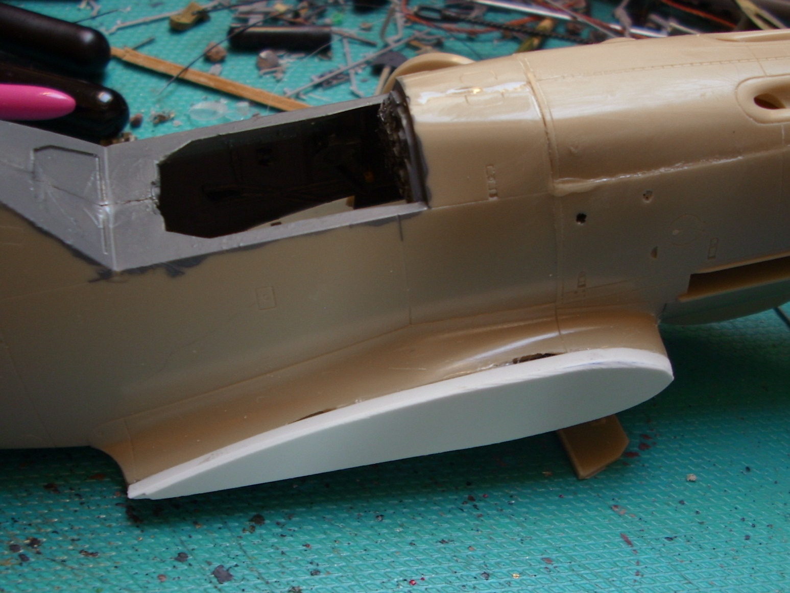 So konnte und sollte es aber nicht bleiben. Vorsichtig mit Messer, Feile und Sandpapier (180) die Stellen soweit geglättet das ich jetzt ein 3mm breiten Plastikstreifen von 0,4 mm zuschneiden und ankleben konnte.