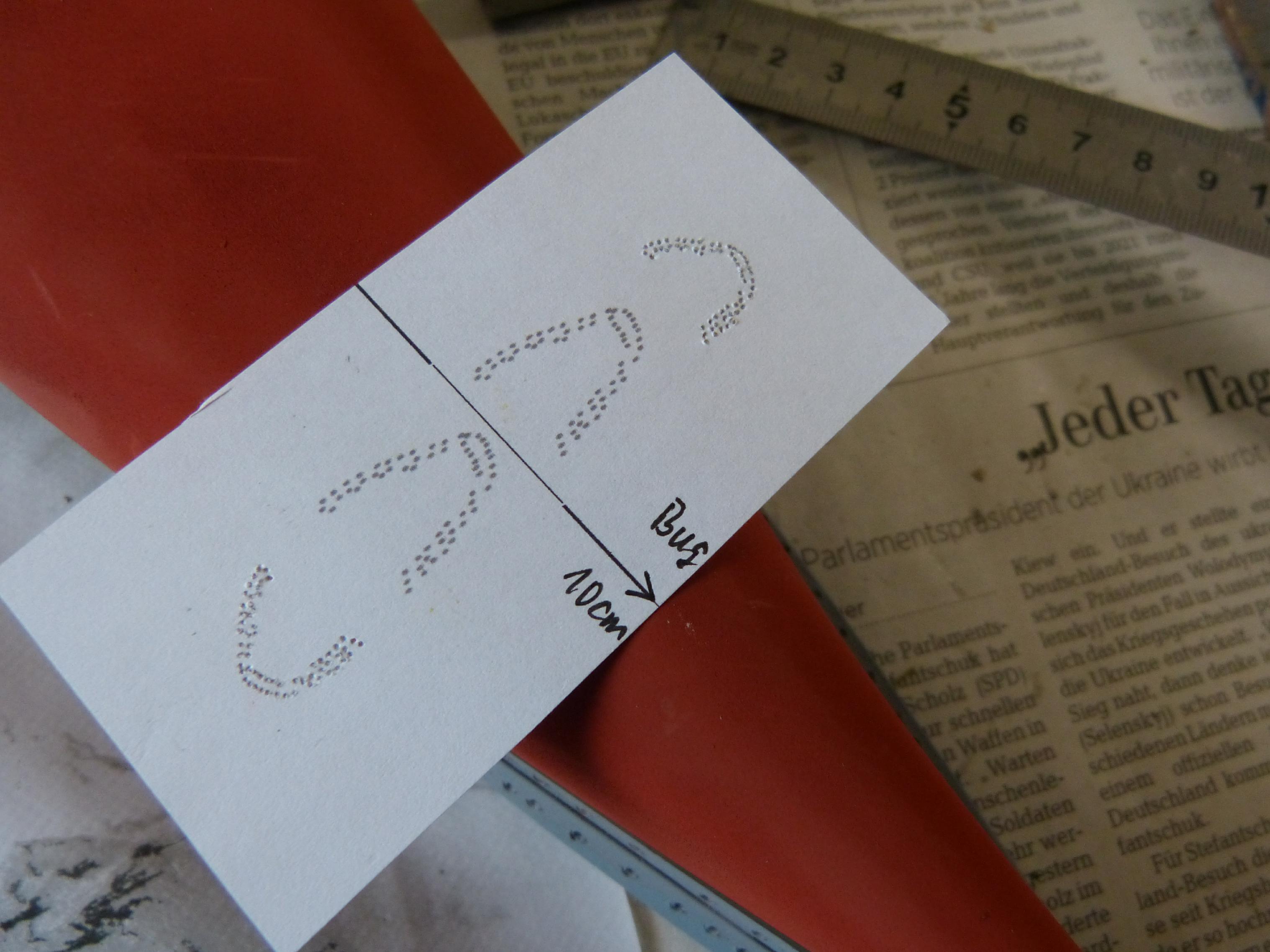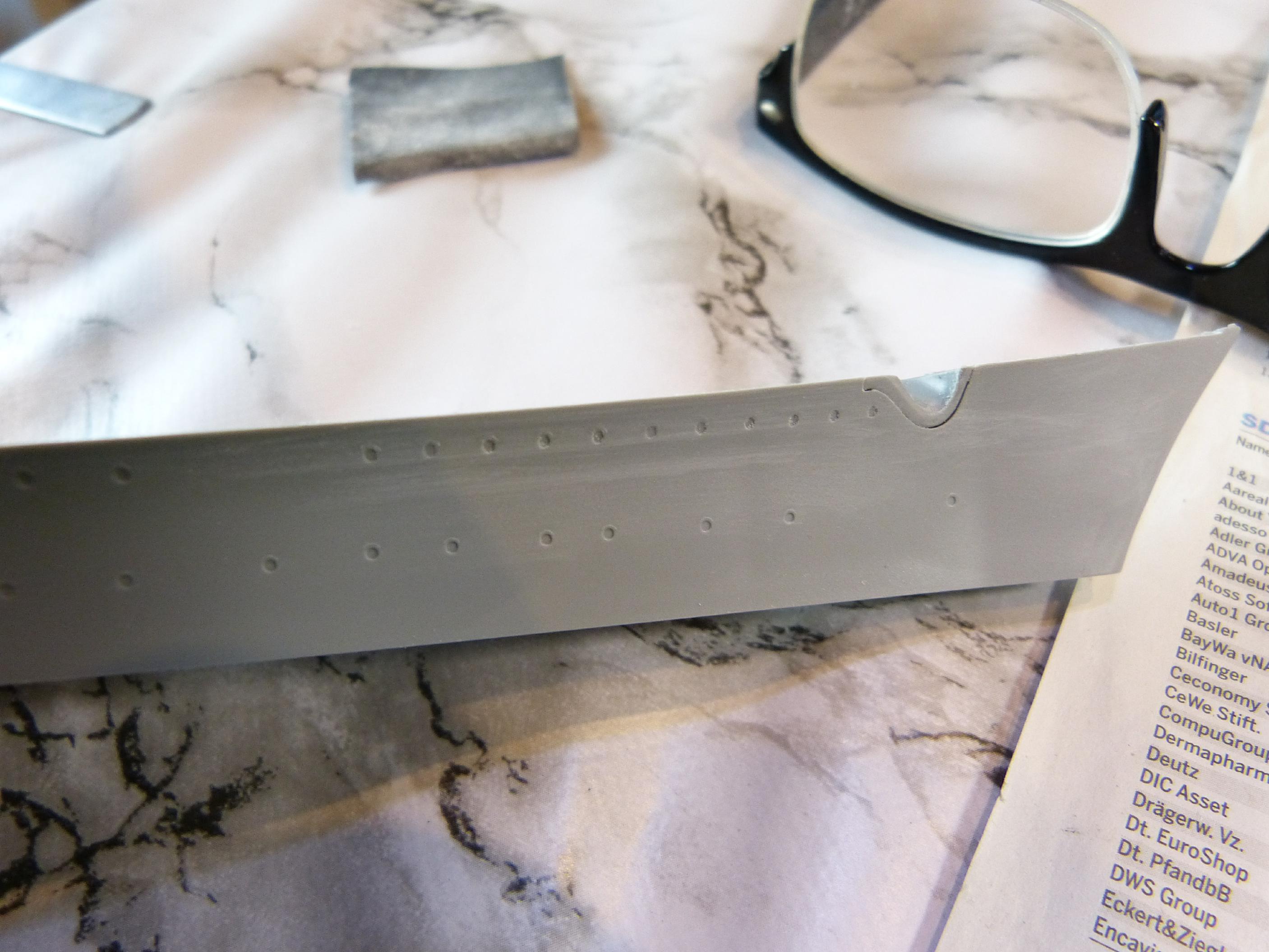 Zunächst zeichnete ich mittels wasserfestem Stift die Einlässe maßstabgerecht auf den Rumpf, und zwar einer steuerbords und zwei an backbord. Dann mit schwerer Technik (Dremel) ran und grob Löcher reingefräst. Anschließend mit Schlüsselfeilen, Schleifpapier, Spachtelmasse und Messer bearbeitet.