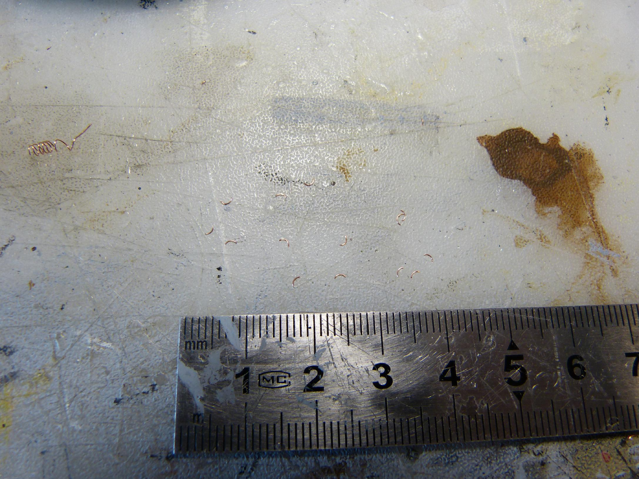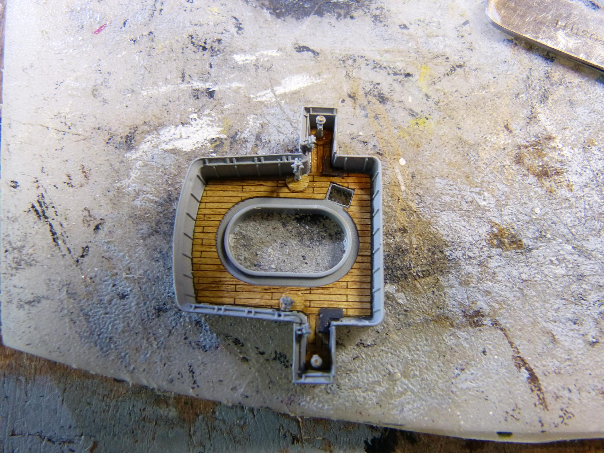 Nun grob zunehmende Längen dünnen Plastiksheets zurechtgeschnitten, dabei jeweils eine lange Seite konisch angeschliffen (wie bei einem Messer). Insgesamt sieben Stück. Anschließend übereinander geklebt und auf die passende Aussparung im Rumpf zurechtgeschnitten.