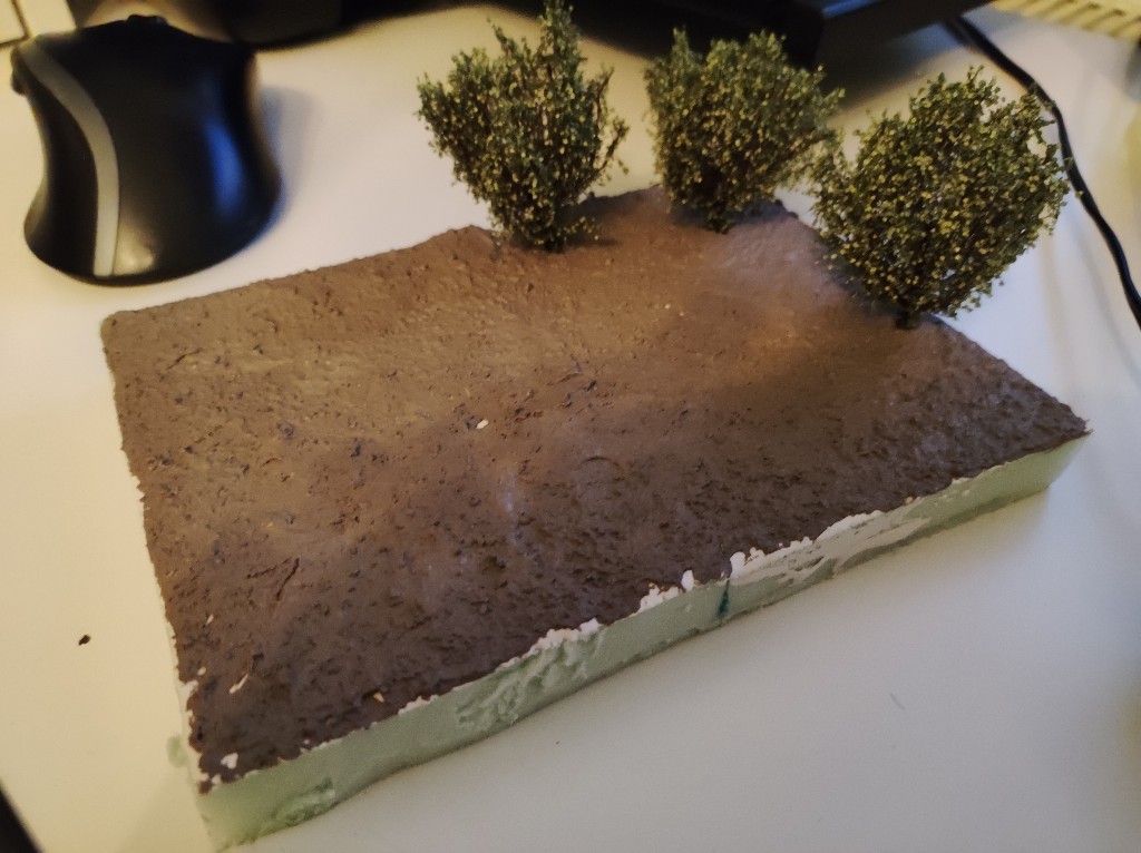 Nun denn, wollen wir Mal an das Diorama gehen. Zunächst habe ich mit Acrylerde den Boden bearbeitet, bzw erstmal bedeckt und Probegestellt.