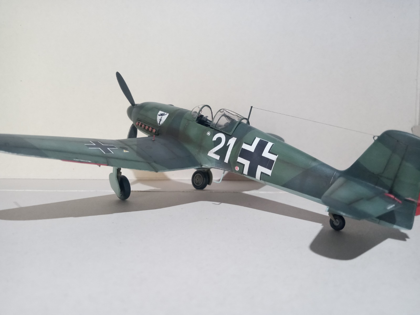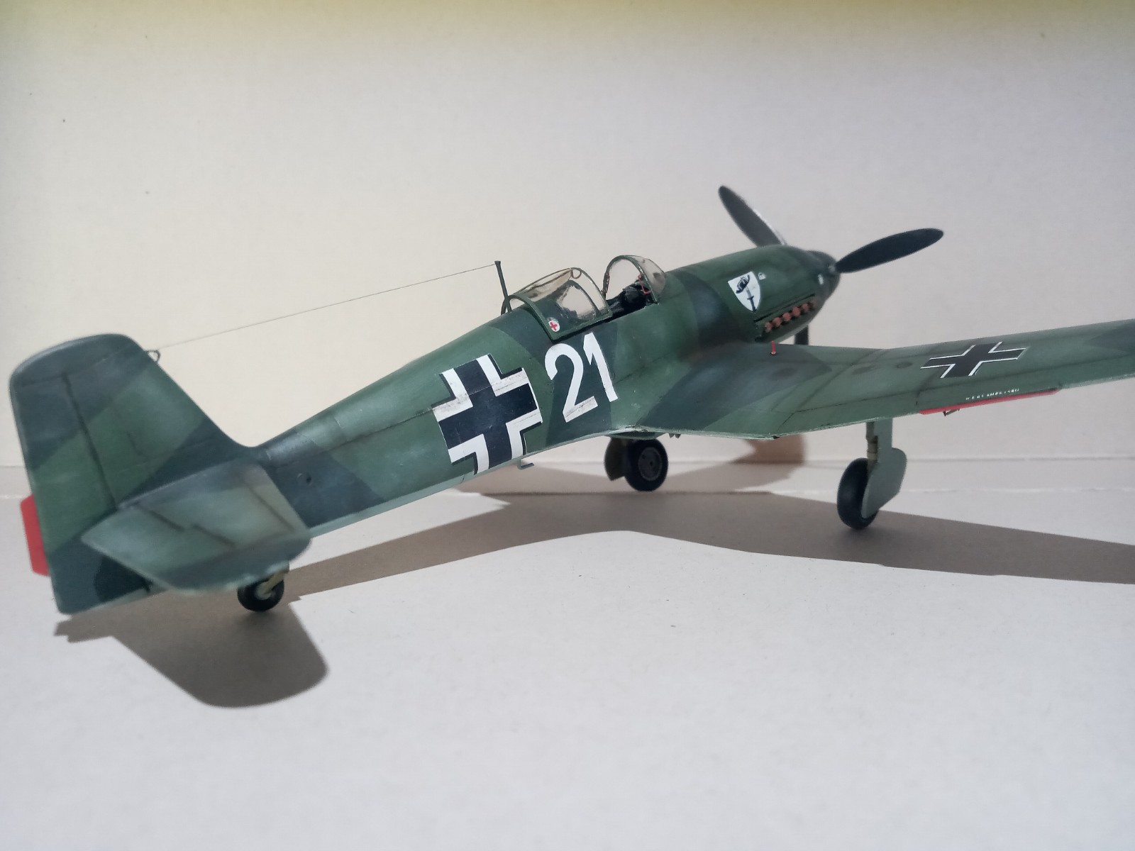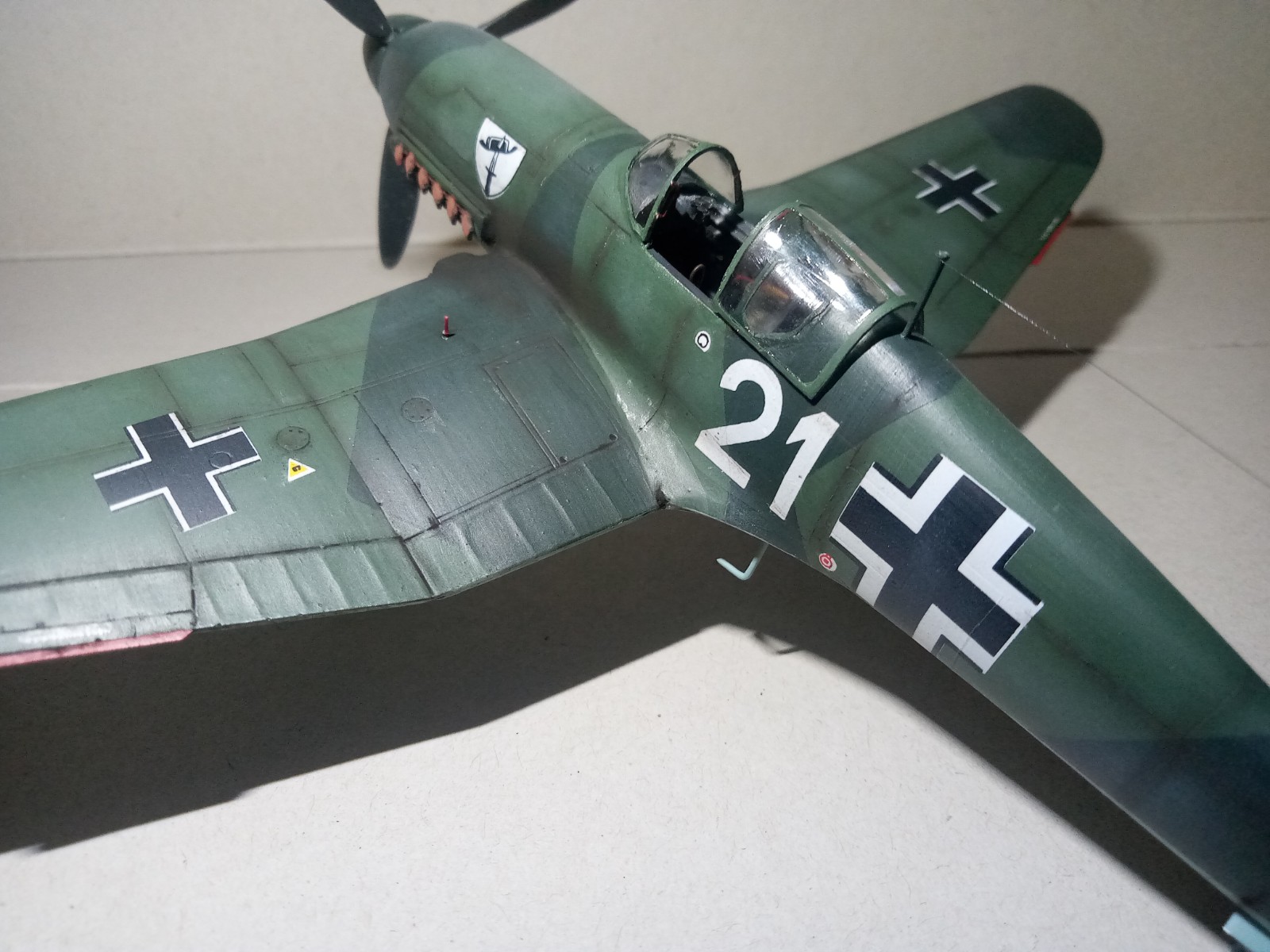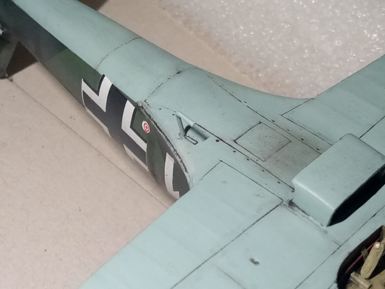 Beim Balkenkreuz bietet es sich an, die Kennzeichen randgenau auszuschneiden. So hättest du die Randstreifen, wie sie auf dem Rumpf links und, weniger deutlich, auch an anderer Stelle zu sehen sind, vermieden. Die vorherige Grundierung mit Glanzlack wäre auch nur unter der 21 nötig gewesen, da die Kreuze ja blickdicht sind und nicht silbern.