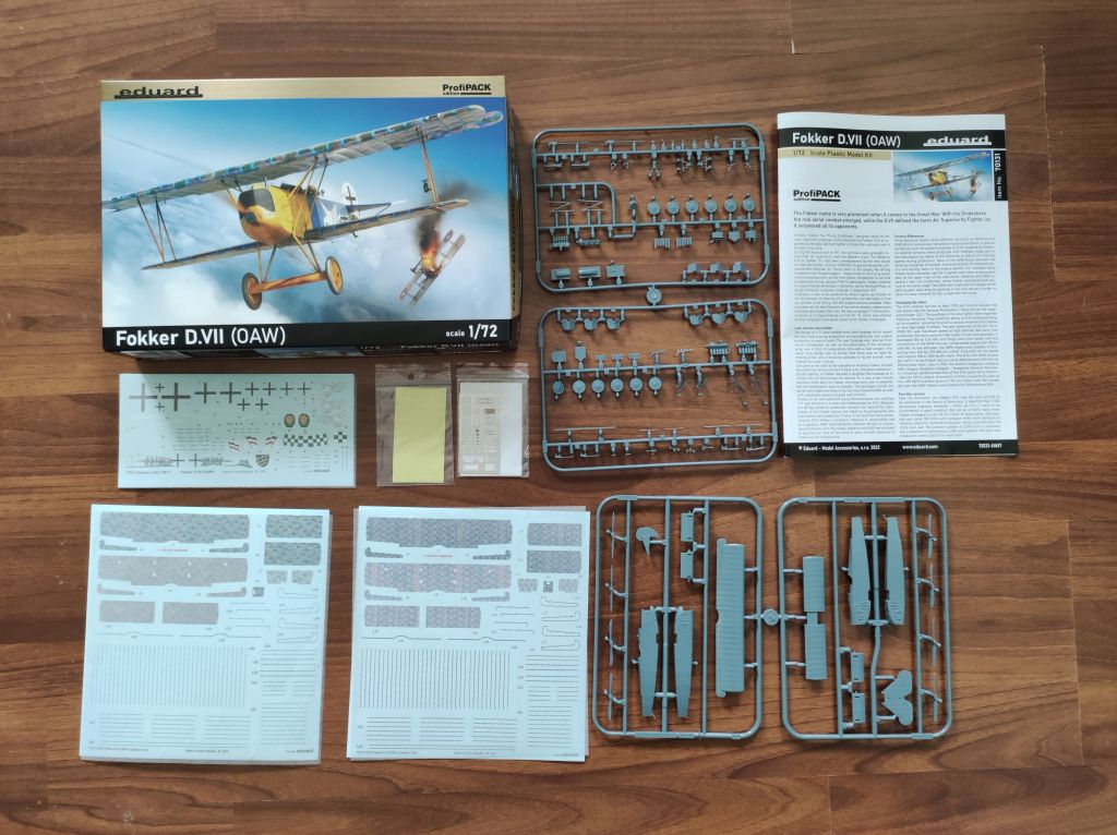 Es handelt sich um Eduards neuste Auflage des Fliegers in der Profipack-Edition. Das heißt neben den Plastikteilen gibt es eine PE-Platine, Masken und fünf Vorschläge. Wobei man bei der Fokker locker hundert bauen könnte und trotzdem noch immer wieder spannende Vorbilder finden würde. Das sind wir auch schon an dem Punkt der mich an den Set sehr stört: mit nur eine Handvoll weiterer Teile könnte man locker noch eine zweite Fokker bauen, es liegen z.B. zwei verschiedene Rümpfe, Motoren, mehrere Propeller und Kühlerabdeckungen bei. Aber so ein wirklicher Kanckpunkt ist es eigentlich nicht.