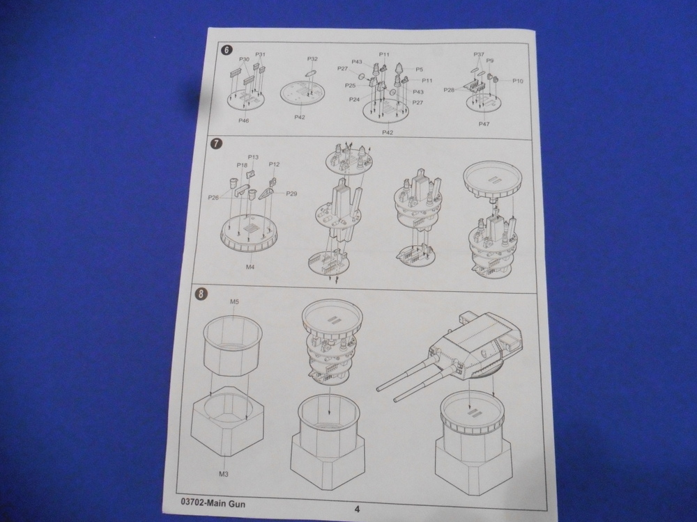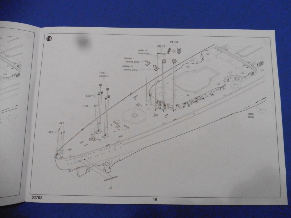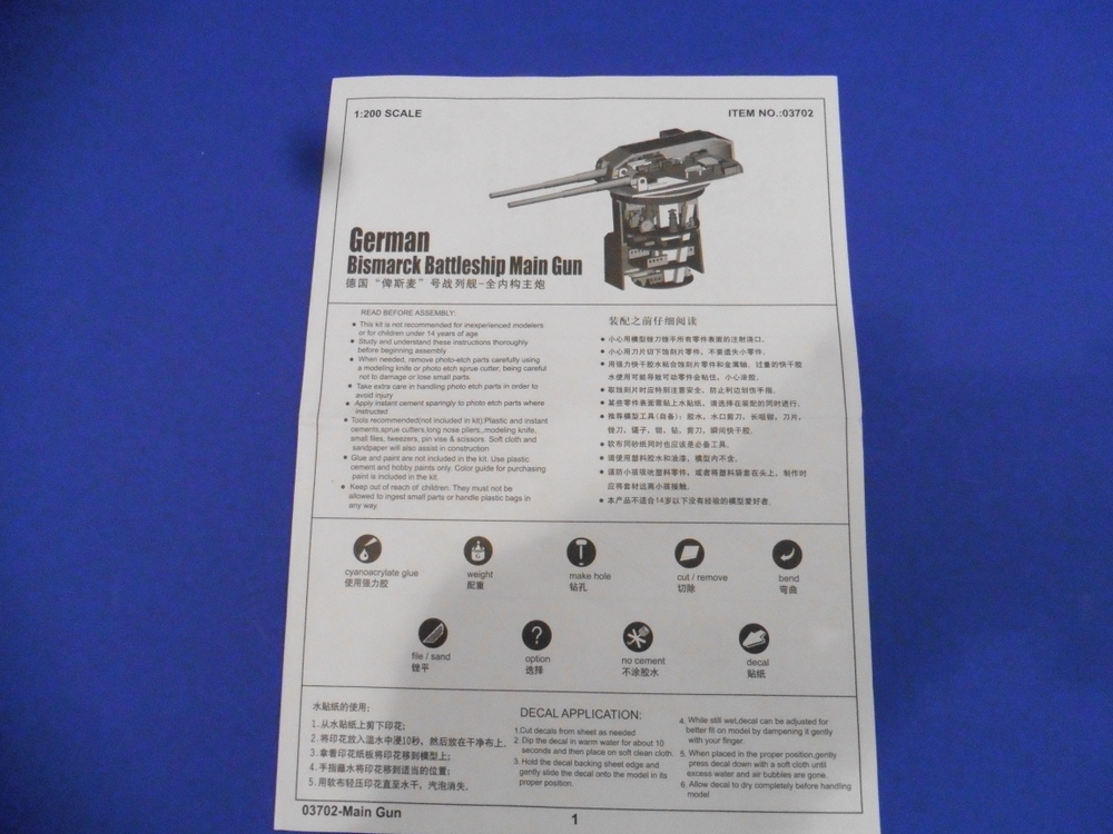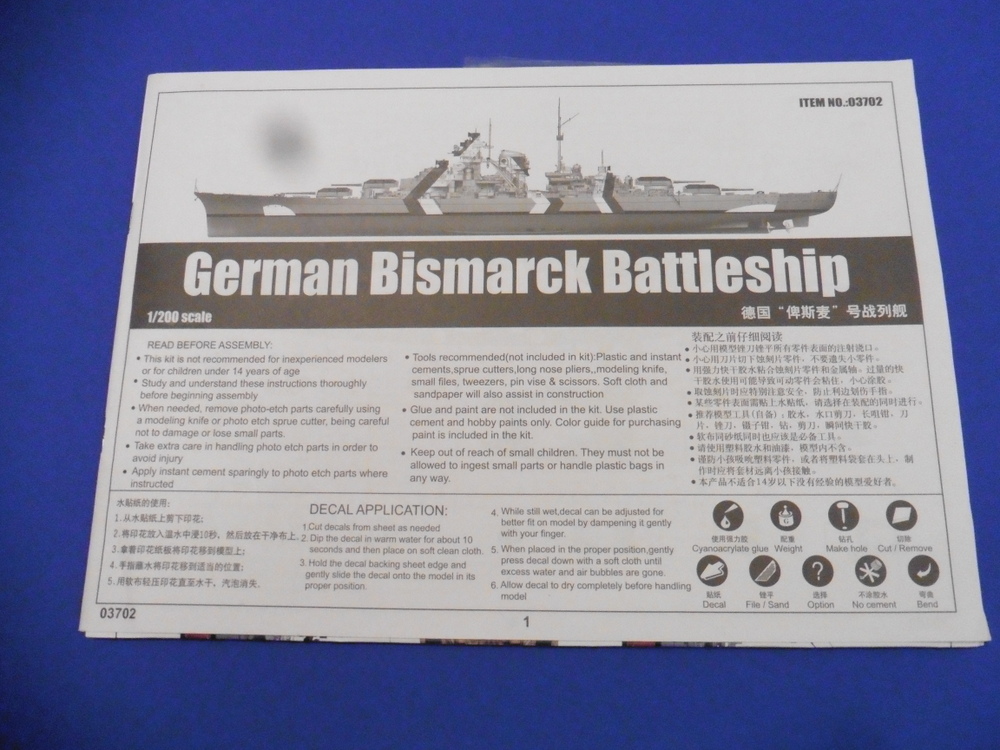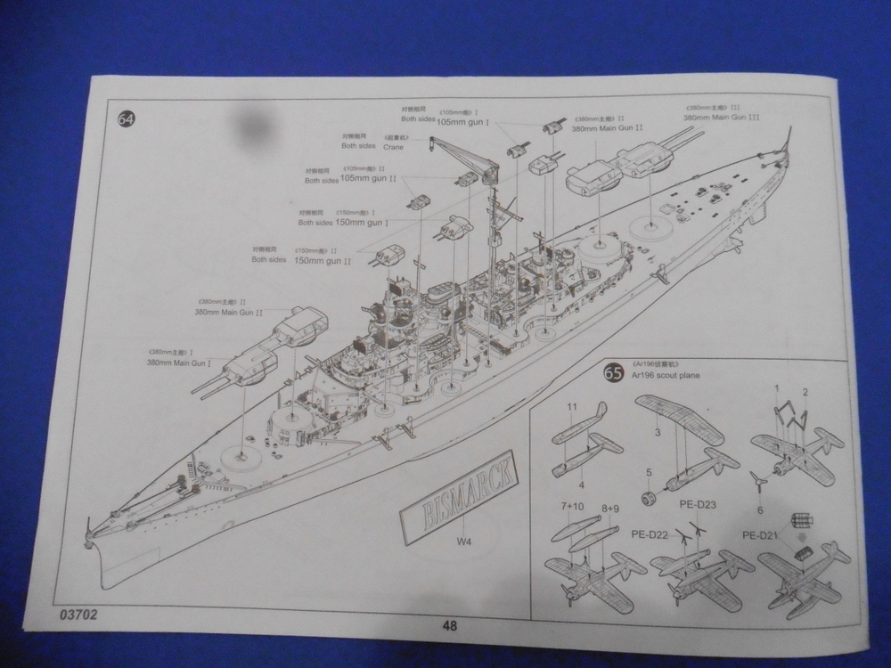 Die Bauanleitung umfast 64 Seiten. Ein Farbschema der Bismarck und ein Decalblättchen liegen bei . ( Da hätte ich mehr erwartet . zB ein Flaggensatz für den Signalmast etc.) Auch der Aufsteller inkl dem Namensschild wirkt doch billig und einfach . Hier hätte mehr drin sein können.