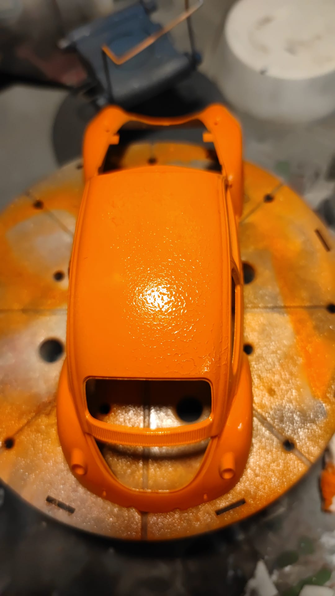 Es ist woe verhext.... beim Käfer das gleiche Problem. Karosse grundiert, lackiert und dann klarlack drauf. Nur das Dach sieht dann so aus.