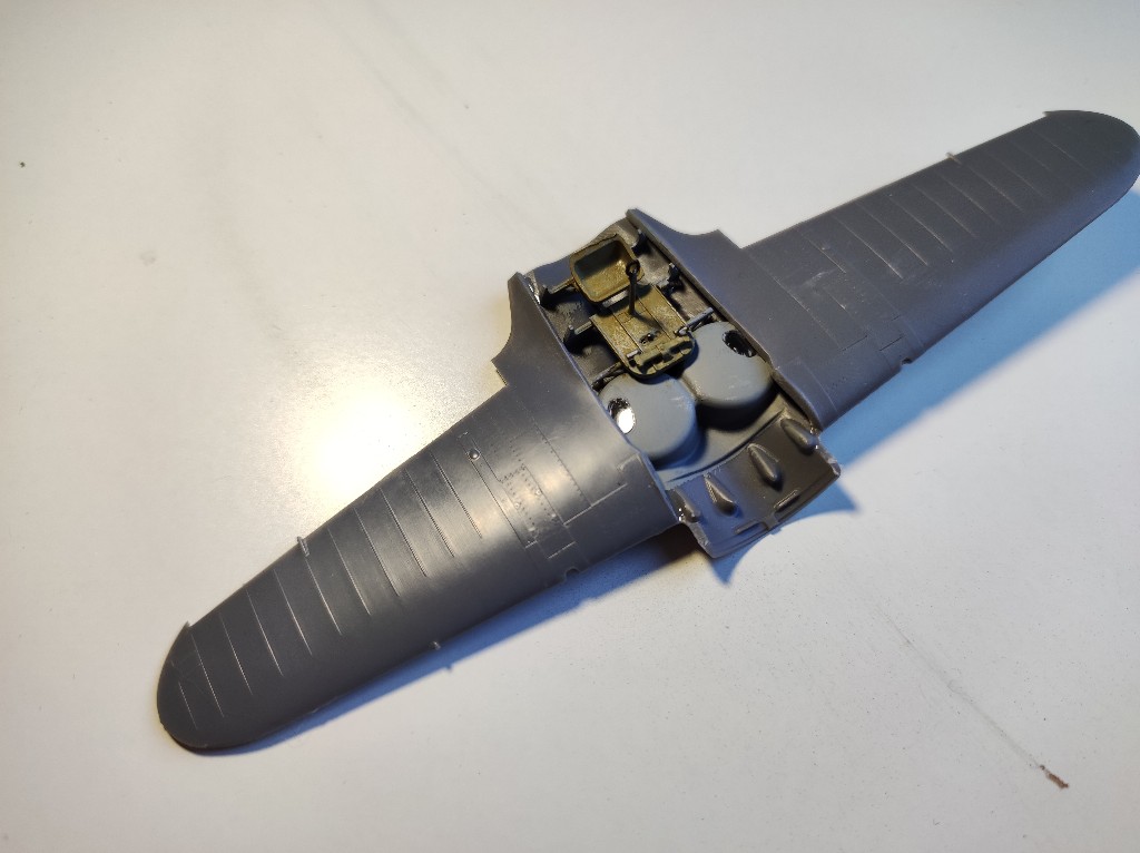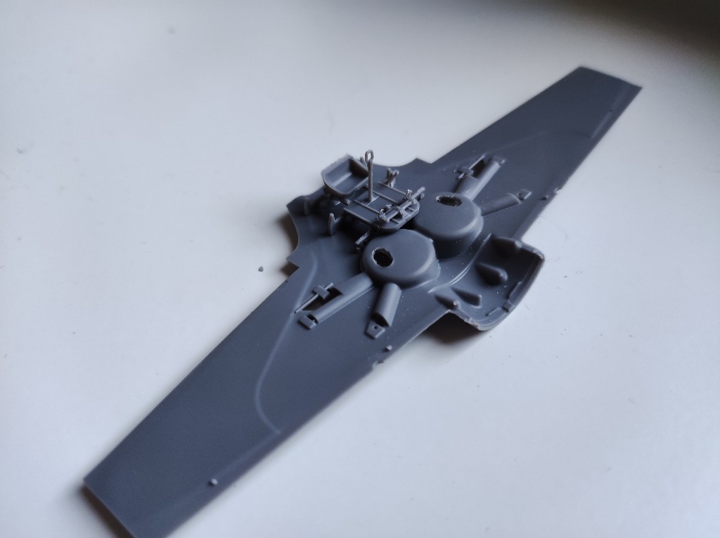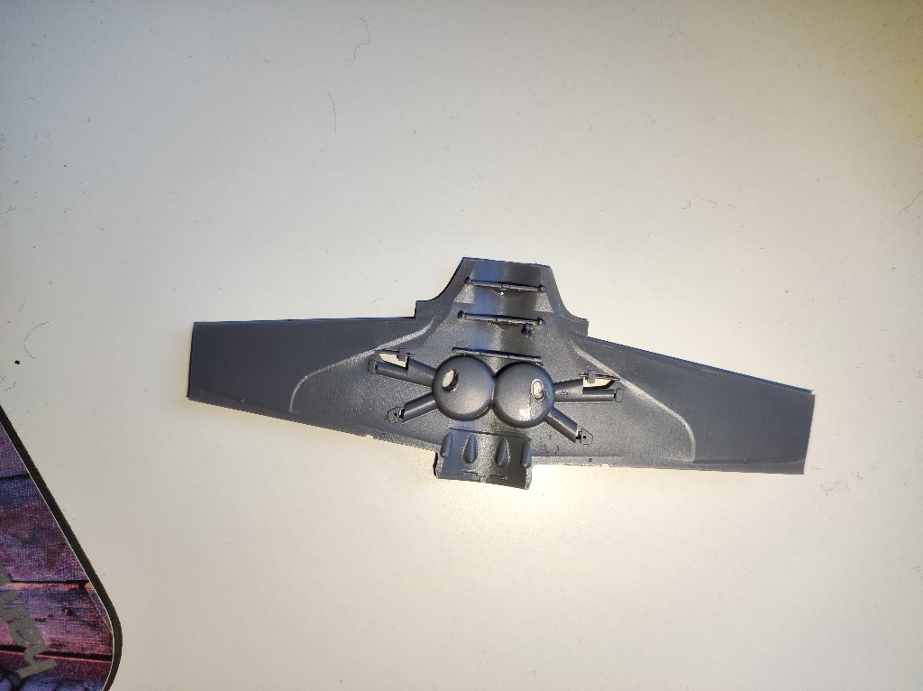 Das ganze wurde nun auf die Flügel eingesetzt und der obere Rumpf angebracht. Überraschender Weiße ein Klarteil