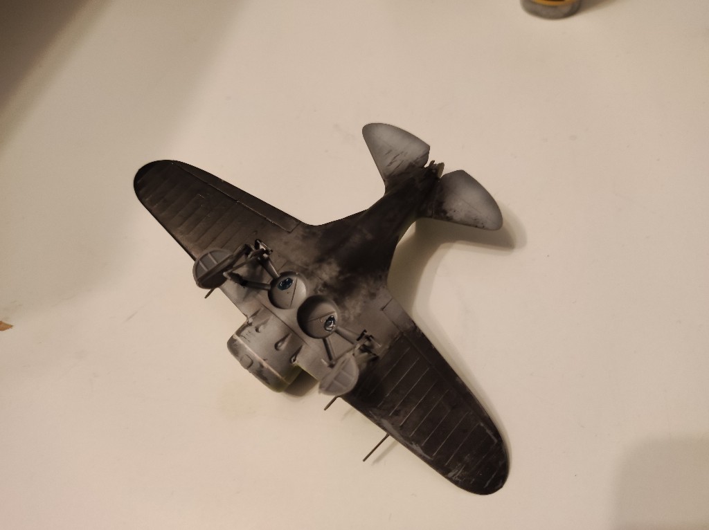 Die I-16 ist ein ganzes Stück weiter gekommen, bzw wurde lackiert. Mit einer Grundierung hatte ich Angefangen und anschließend Teile der Unterseiten mit Schwarz Glänzend lackiert.