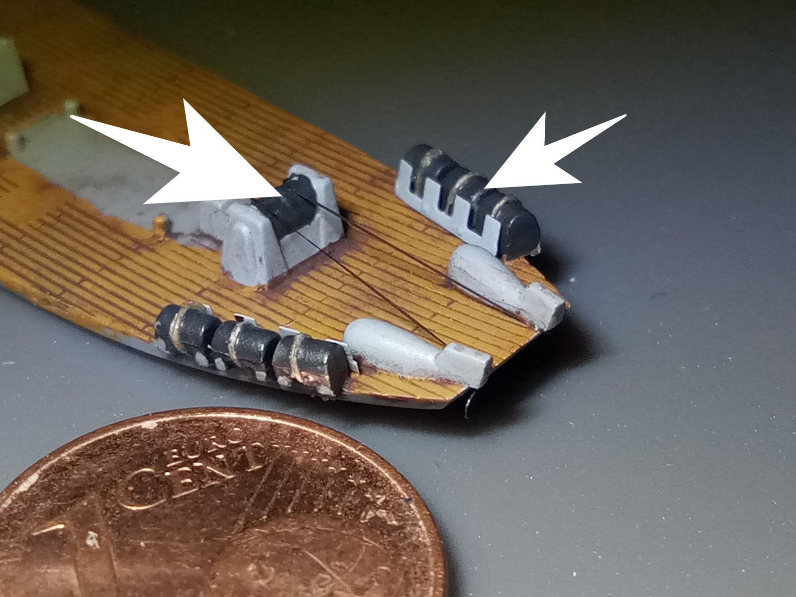 Die Stützen der Reling habe ich von den oberen Rumpfteilen entfernt.