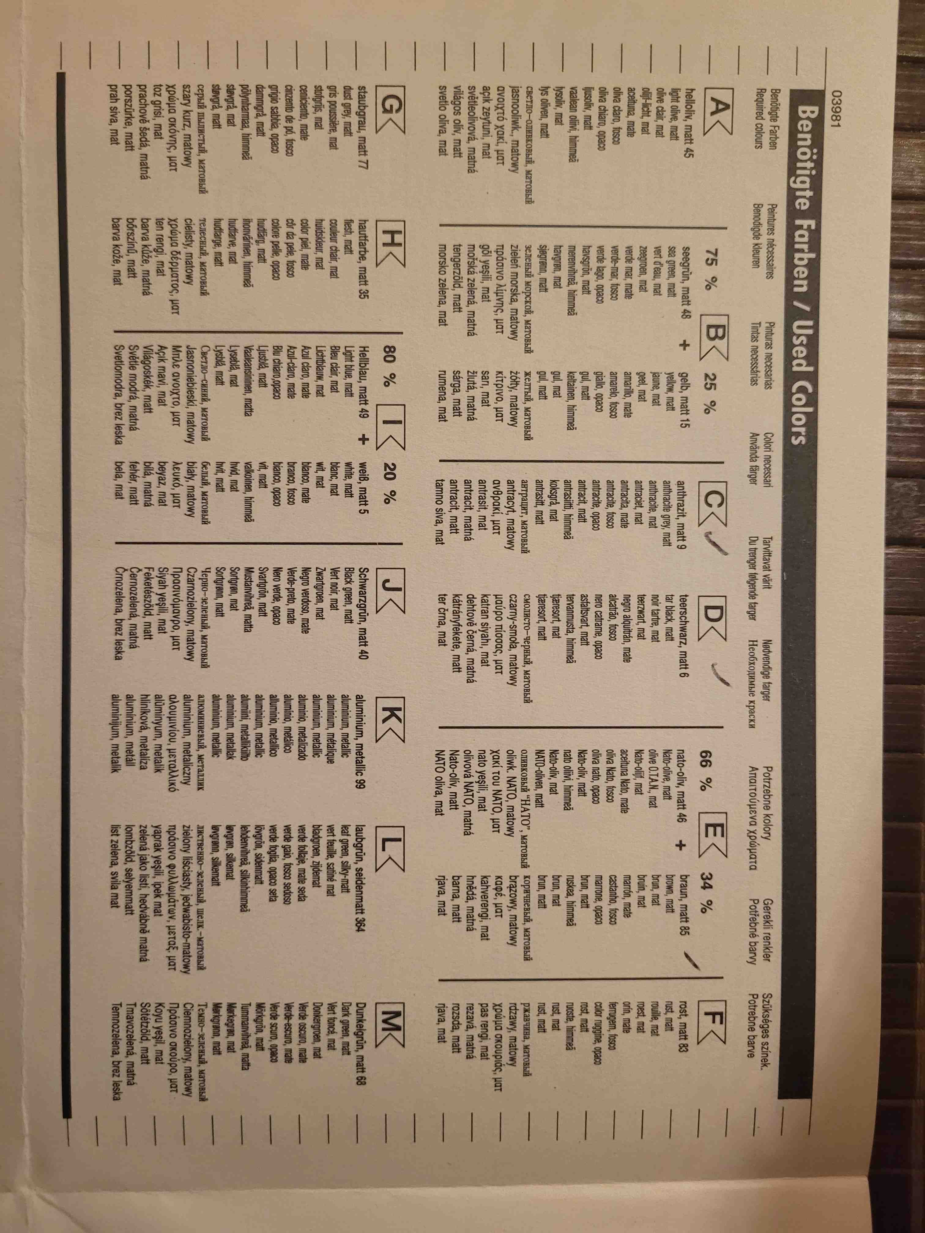 In Schritt 6 frage ich mich, was denn nun mit Farbe C (Anthrazit) bemalt werden soll. Einfach nur die längere Strebe? Oder die gesamte Fläche, zumindest im mittigen Abschnitt? Bei Farbe K (Aluminium) endet der Strich unten zumindest bei den kürzeren, gewinkelten Streben. Soll mit K dann aber auch diese Wulst bemalt werden?